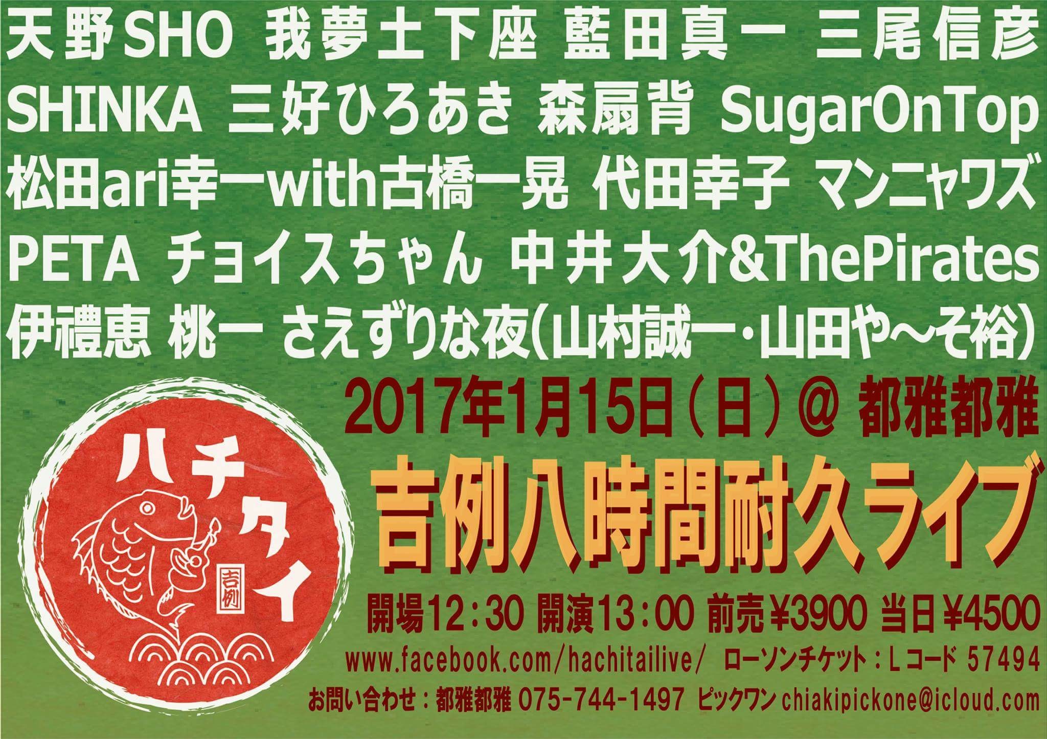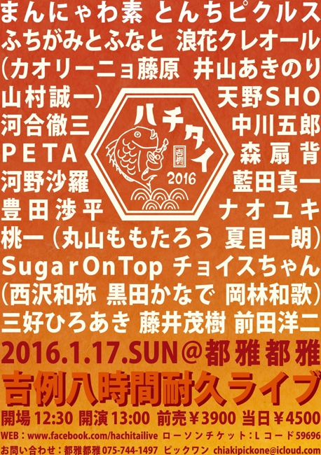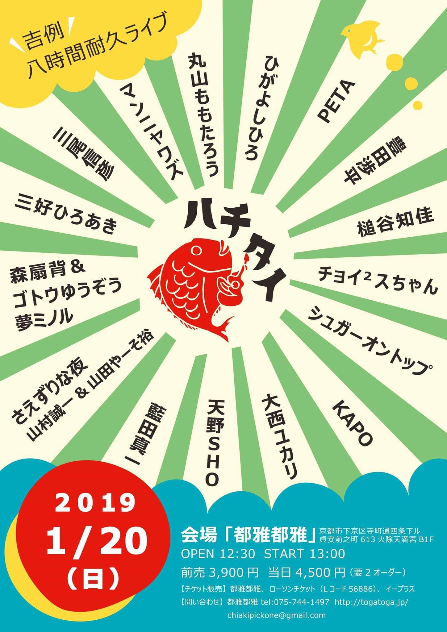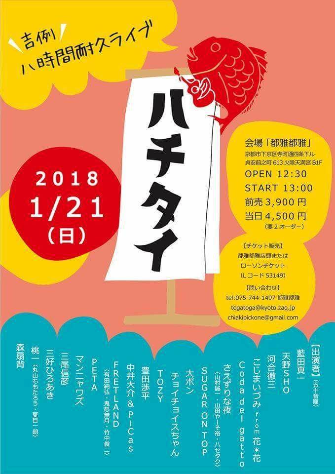 20 @ 都雅都雅 togatoga(京都 四条寺町)"ハチタイ2020~ 吉例八時間耐久ライヴ "★出演者(五十音順); 天野SHO / 激団モンゴイカ / Sugar on Top / The Small Rascals / 茶木みやこ / チョイスちゃん / 槌谷知佳 / Toy Flower (夏目一朗、ペーニャ大作) / 豊田渉平&湯澤かよこ / 長野友美 / にいじゅん / ふちがみとふなと / PETA / マッテマンガナーズ!(三井雅弘、中村岳、川辺ぺっぺい、田辺敏男) / 丸山ももたろう / 三尾信彦 / 三好ひろあき / 森扇背