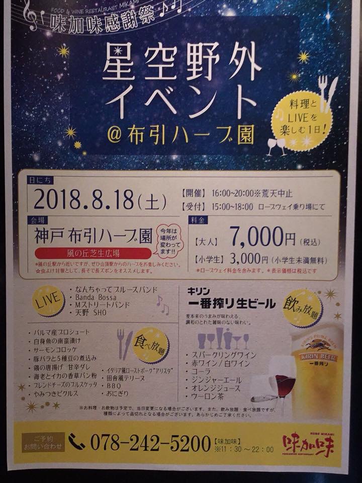 28 @ 神戸布引ハーブ園 風の丘芝生広場(新神戸ロープウェイ「風の丘」駅)"味加味☆星空野外イベント" 【 中止 】