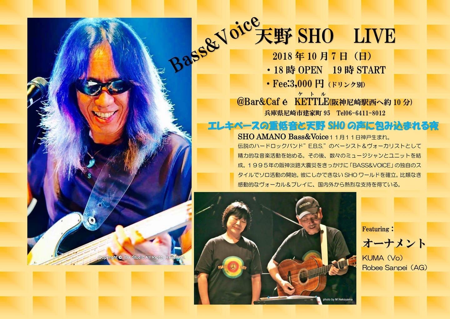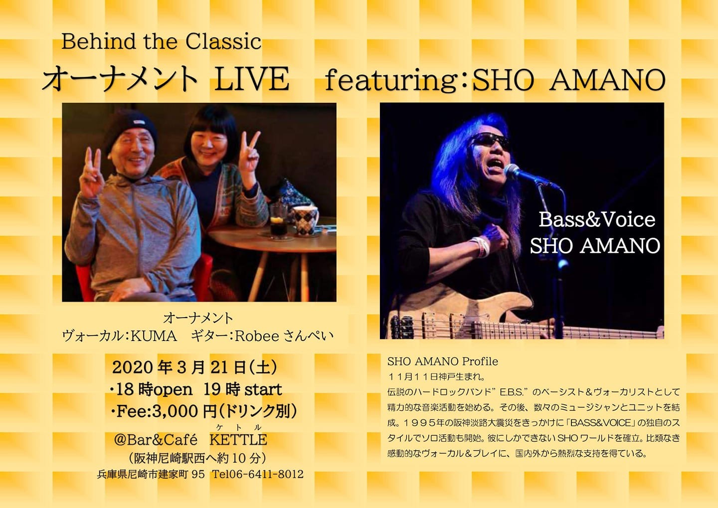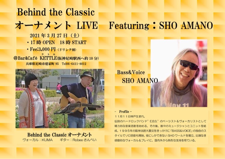 21 @ Bar & café KETTLE(尼崎 出屋敷)"オーナメントLIVE 〜 Behind the Classic" ★オーナメント:KUMA(Vo) / Robee さんぺい(AG) ★featuring SHO AMANO