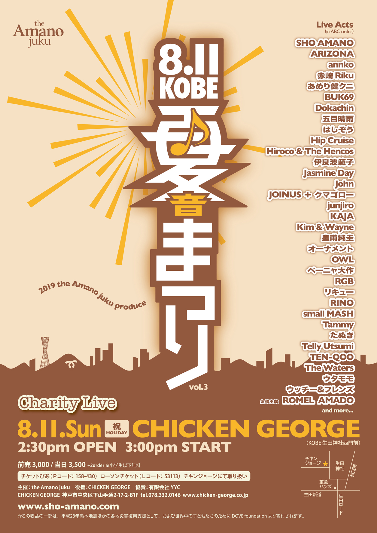 09 @ CHICKEN GEORGE(KOBE 三宮 生田神社西門前)"8.09 KOBE 夏*音*まつり vol.5" Charity Live produced by 2021 the Amano juku ★Live Acts : SHO AMANO / BUK71 / KAJA / 皇甫純圭 with 森俊樹 / 夏音 Tune【たぬき / サダやっち / レキ / NORI / Jasmine Day ...and friends】/ ペーニャ大作 / small MASH / The Waters / ウタモモ & ALL STARS ◆オンライン配信◆ 神戸市ホール公演有料ウェブ配信補助対象事業